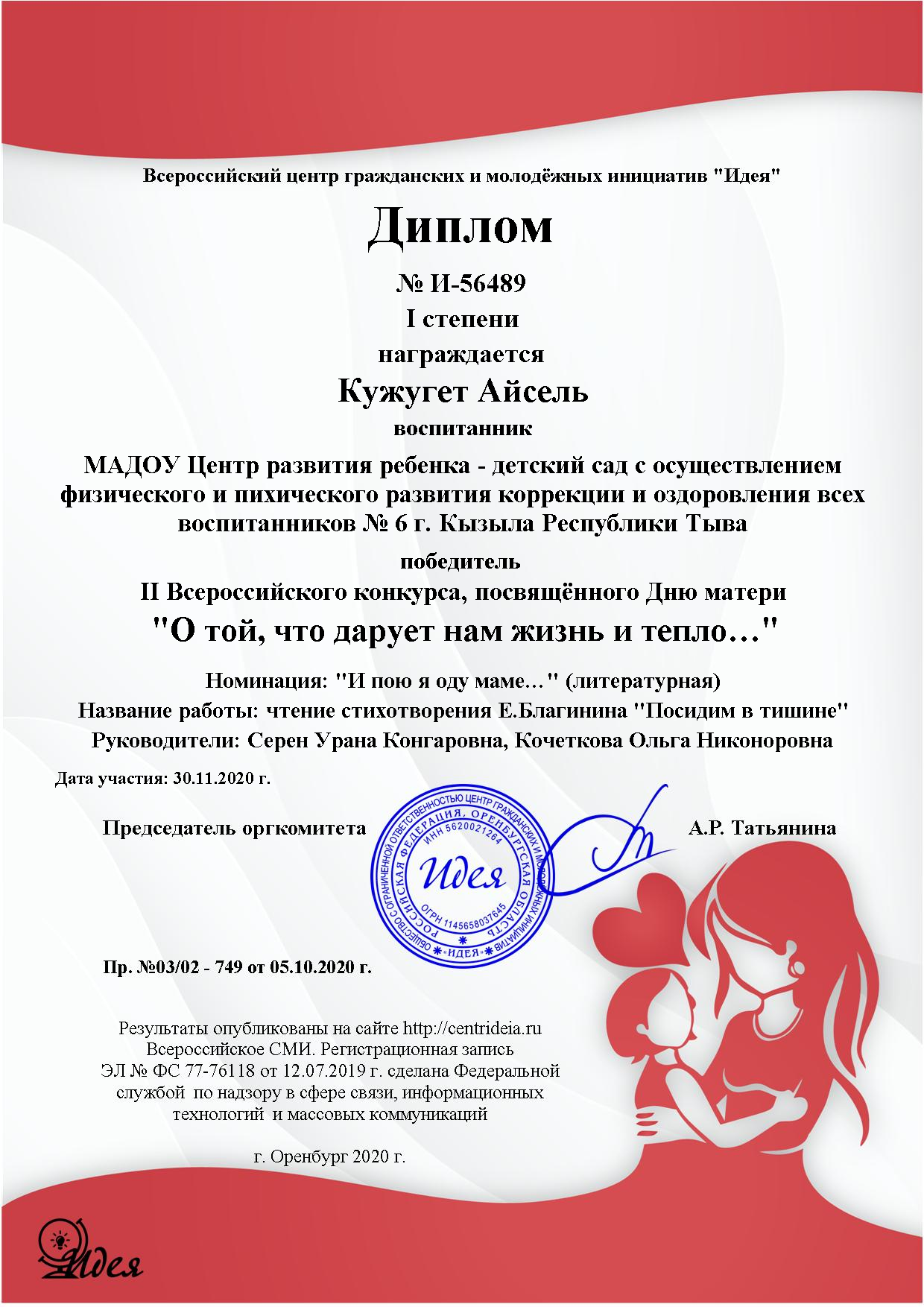 Без рубрики День отца и день матери в ДОУ 31.12.2020 / Была проведена следующая работа: Кужугет-Айсель грамота участие в конкурсе чтецов.Скачать отчет-матери-и-отца-в-доуСкачать